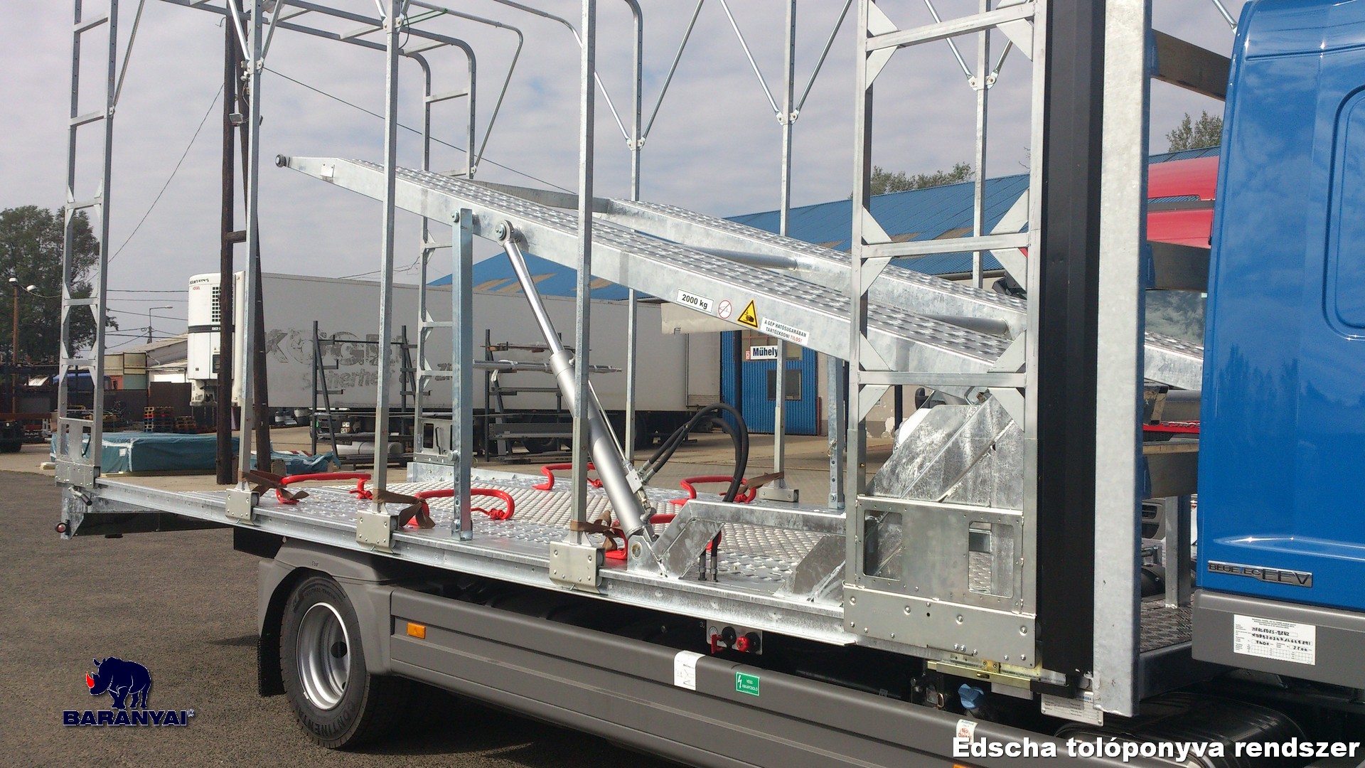 Új-illetve sérült autók szállítására alkalmas fix-ill. csúsztatható vázú felépítményeink igény szerint acél, rozsdamenetes vagy alumínium vázas egy-vagy kétszintes kivitelben rendelhetők. Padozata általában ajakosan perforált-vagy cseppmintás lemezből készülnek. Homlokfalnál igényes, jó minőségű (WIME, TAUBENREUTHER, AL-KO…) elektromos-vagy hidraulikus csörlő található.